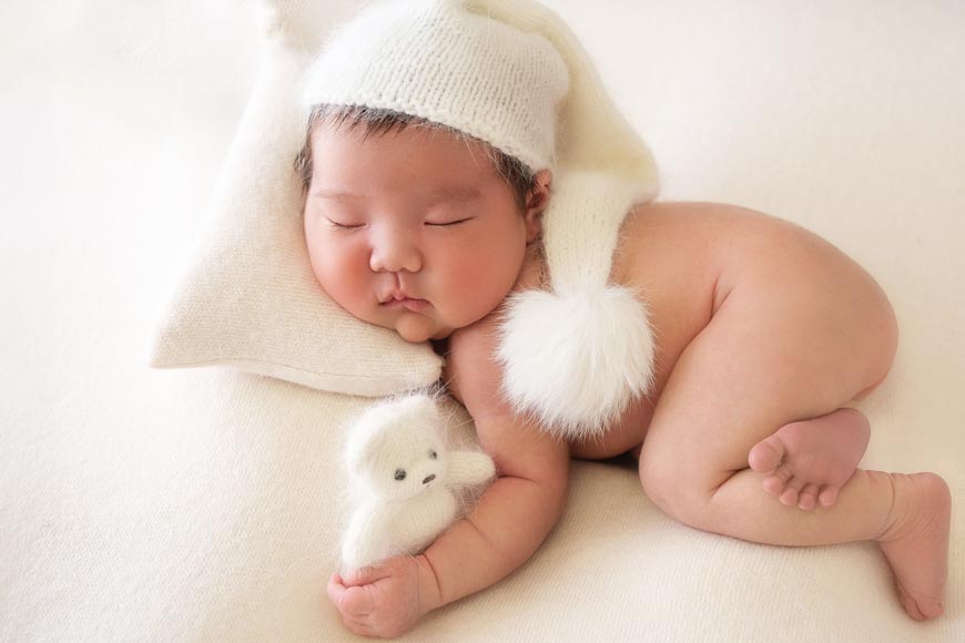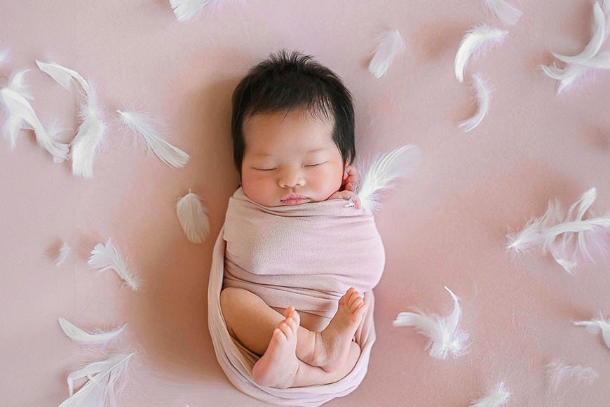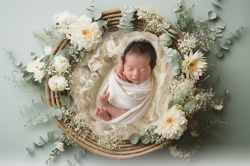 2種類のスタイリング「シンプルな布背景+はだかんぼ又は洋服」、「かごを使ったスタイリング+おくるみ」で撮影するプランです。アートレタッチ仕上げで赤ちゃんをさらにかわいくします。 10カット/デジ1カット/ミニパネル1枚/プリントクーポン3000円付き